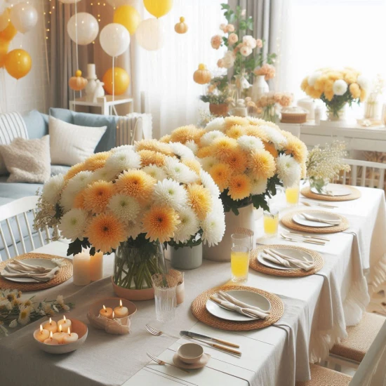 Bukiety z chryzantem można umieścić w wazonach na stołach, podczas gdy wianuszki chryzantemowe mogą ozdabiać drzwi wejściowe lub ściany, wprowadzając gości w jesienny nastrój.